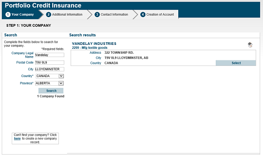 a. Enter your company’s legal name and province, along with any other relevant information, into the fields provided.