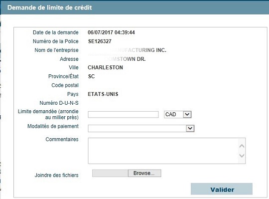 8. Dans la fenêtre Demande de limite de crédit, le système indiquera si la demande a été approuvée (crochet vert), refusée (X rouge) ou est en attente (sablier). Vous recevrez un deuxième courriel de confirmation pour cette décision